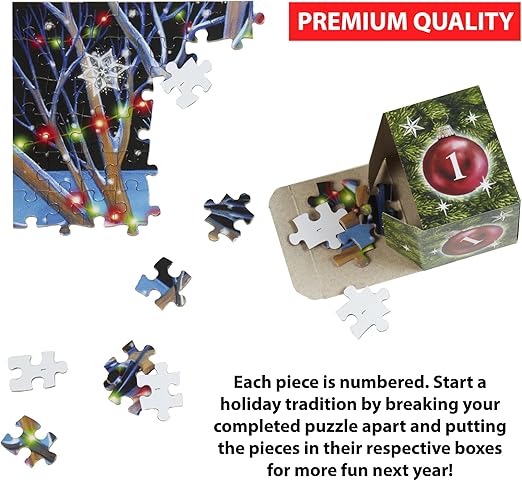 - Kan genbruges år efter år: Du kan tage puslespillet fra hinanden efter jul og opbevare brikkerne i de originale nummererede æsker til næste år.